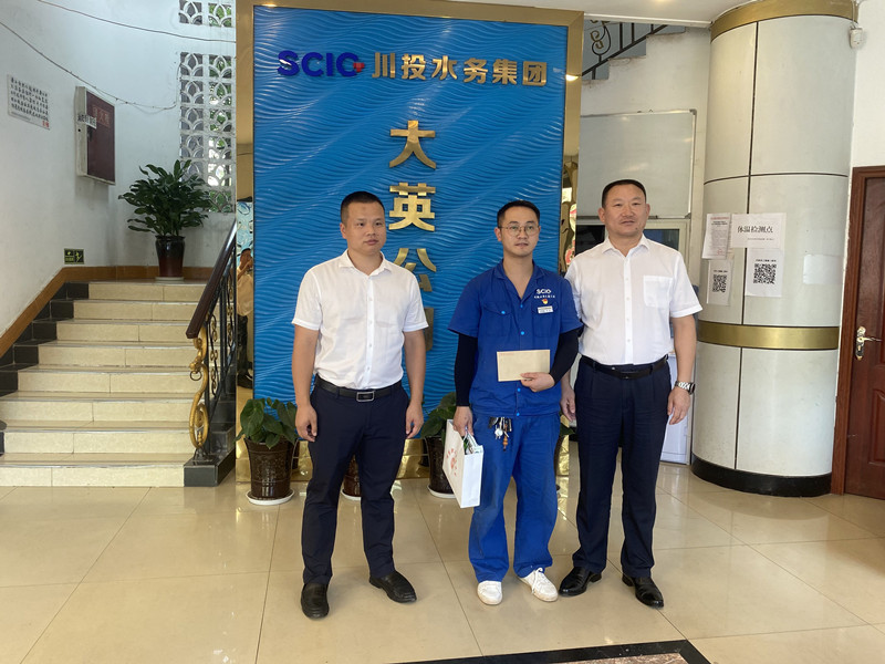 8月10日下午5時(shí)30分,大英縣委副書(shū)記、縣長(zhǎng)胡銘超,縣委常委、縣委辦公室主任、縣總工會(huì)主席譚銀,遂寧市中國(guó)死海旅游度假區(qū)管委會(huì)副主任敬云川等領(lǐng)導(dǎo)來(lái)到川投水務(wù)大英水司老城服務(wù)大廳,向前幾日為最大限度保障供水、降低停水影響、毅然5次潛下灌滿消防水的閘閥井關(guān)閉閘閥而引發(fā)社會(huì)廣泛關(guān)注的川投水務(wù)大英水司“開(kāi)關(guān)俠”魏巍表達(dá)問(wèn)候和祝福,并送上慰問(wèn)金。