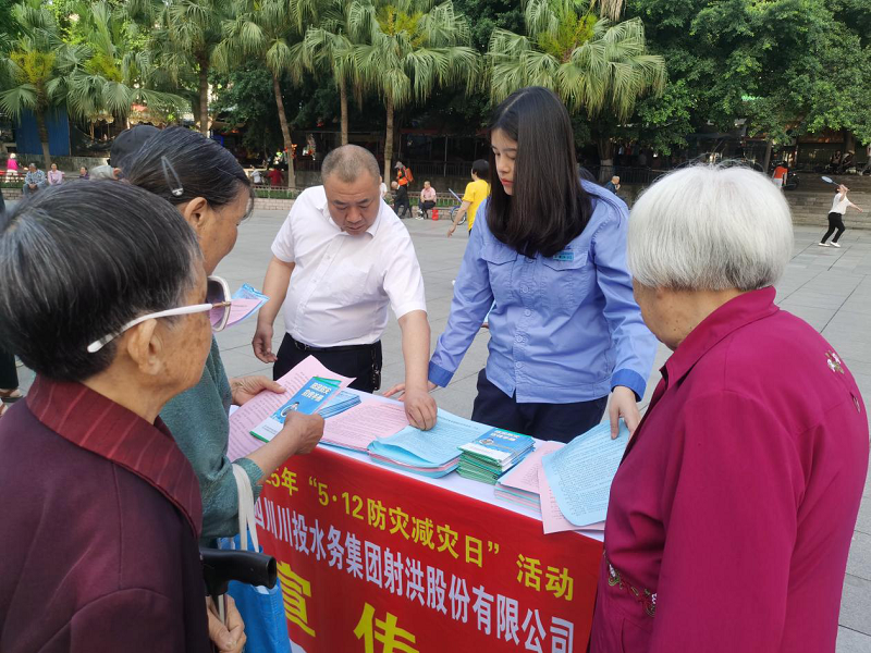 2025年5月12日是我國(guó)第17個(gè)防災(zāi)減災(zāi)日,圍繞“人人講安全、個(gè)個(gè)會(huì)應(yīng)急—排查身邊災(zāi)害隱患”為主題,5月12日上午,按照射洪市應(yīng)急管理局相關(guān)活動(dòng)要求,川投水務(wù)射洪公司在新世紀(jì)廣場(chǎng)開(kāi)展了“防災(zāi)減災(zāi)”集中宣傳活動(dòng)。